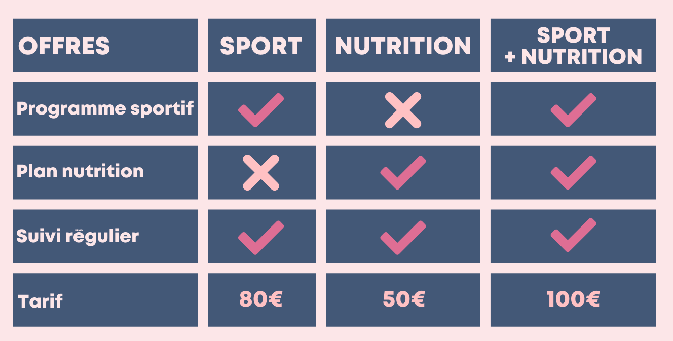Un accompagnement global qui inclut un programme sportif personnalisé et un plan nutrition adapté. Idéal pour transformer ton corps et optimiser tes performances !