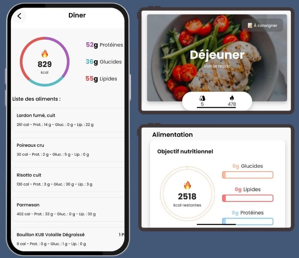 Tu télécharges l'application sur ton smartphone grâce à l'email que je t'aurai envoyé. Ensuite, tu retrouveras sur l'application ton programme sportif avec un agenda des séances, des vidéos de chaque exercice, les charges ainsi que les répétitions et les temps de repos. Dans la partie nutrition, tu as ton plan alimentaire avec les aliments et leur quantités, ainsi que les macronutriments. Tu retrouves aussi tes bilans avec la prise de tes mensurations et ton poids de départ. Tu peux laisser des notes sur l'application après chaque séance.